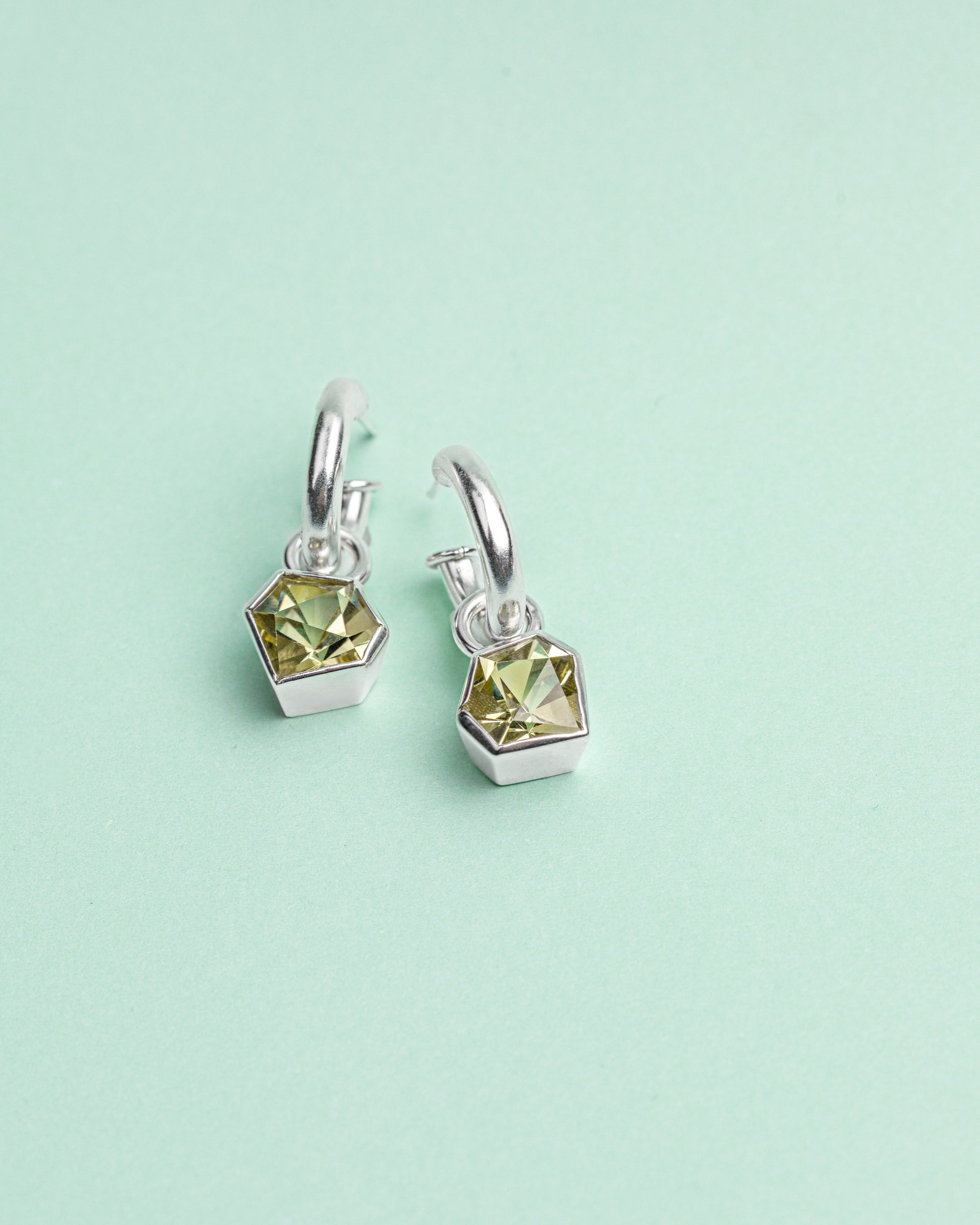 Silver charm hoops. The charms are detachable and available in multiple interchangeable gemstones